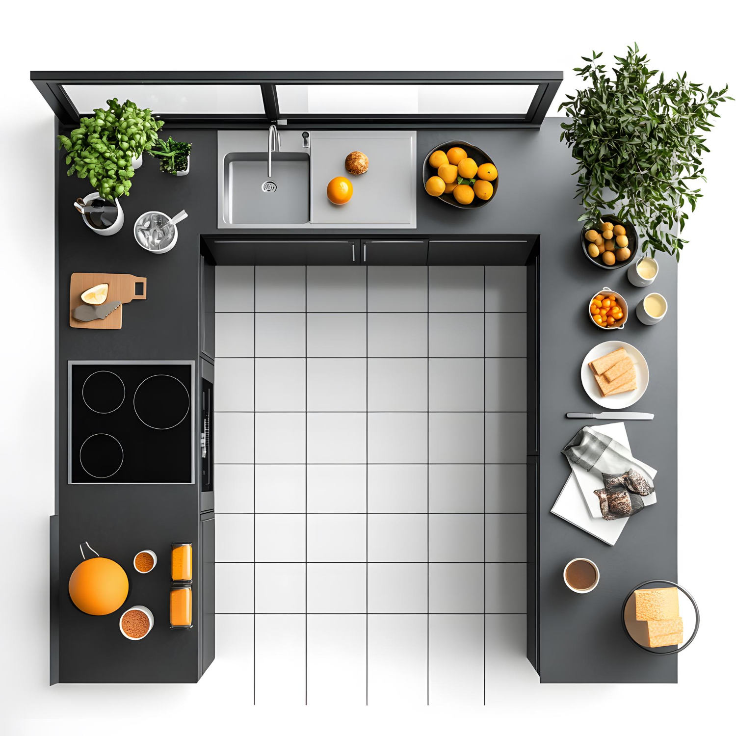 - The sink, cooker, and refrigerator can be distributed along the sides of the layout in line with kitchen layout standards that focus on a clear movement path.